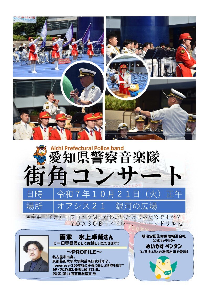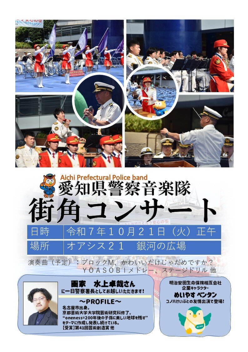 2025.09.26 お知らせ 10月21日 オアシスイベントに参加します! 東警察 一日署長を務めます 愛知県警音楽隊 街角コンサート のイベントに参加いたします。皆さん応援にいらしてください。栄オアシス21 銀河の広/東区東桜1-11-1 前のページを表示 お知らせ一覧へ戻る